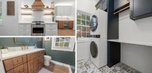 Beyond the kitchen, the remodel extended into a refreshed powder room and a redesigned laundry area. In the laundry room, new flooring, a built-in tower cabinet for the washer and dryer, and added folding and hanging space transformed the area into a more functional and stylish part of the home.